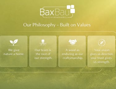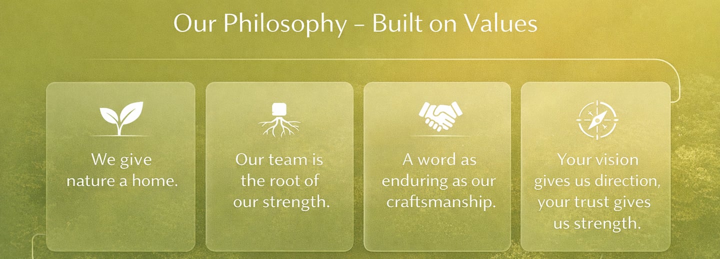 Our work is built on clear values and a mindset that shapes everything we do. For over a decade, we have stood for more than just professional garden and landscape construction. Our values reflect the principles that guide our planning, design, and execution. They provide direction, inspire trust, and form the foundation for long-term partnerships.