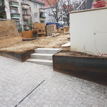 Garageneinfahrt und Stellplatz inkl. Gartenzugang aus Naturstein, Cortenstahl und Abwassersystem