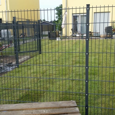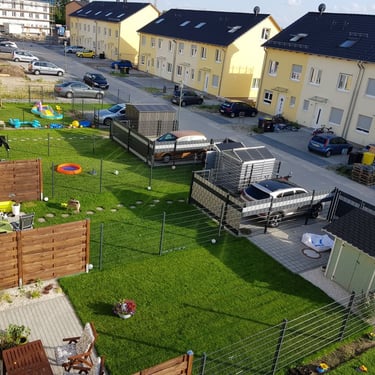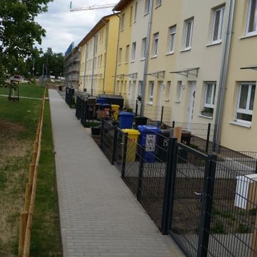 Zaunanlagen für Reihenhäuser mit Schiebetor, Vegetationsflächen und Müllplätzen